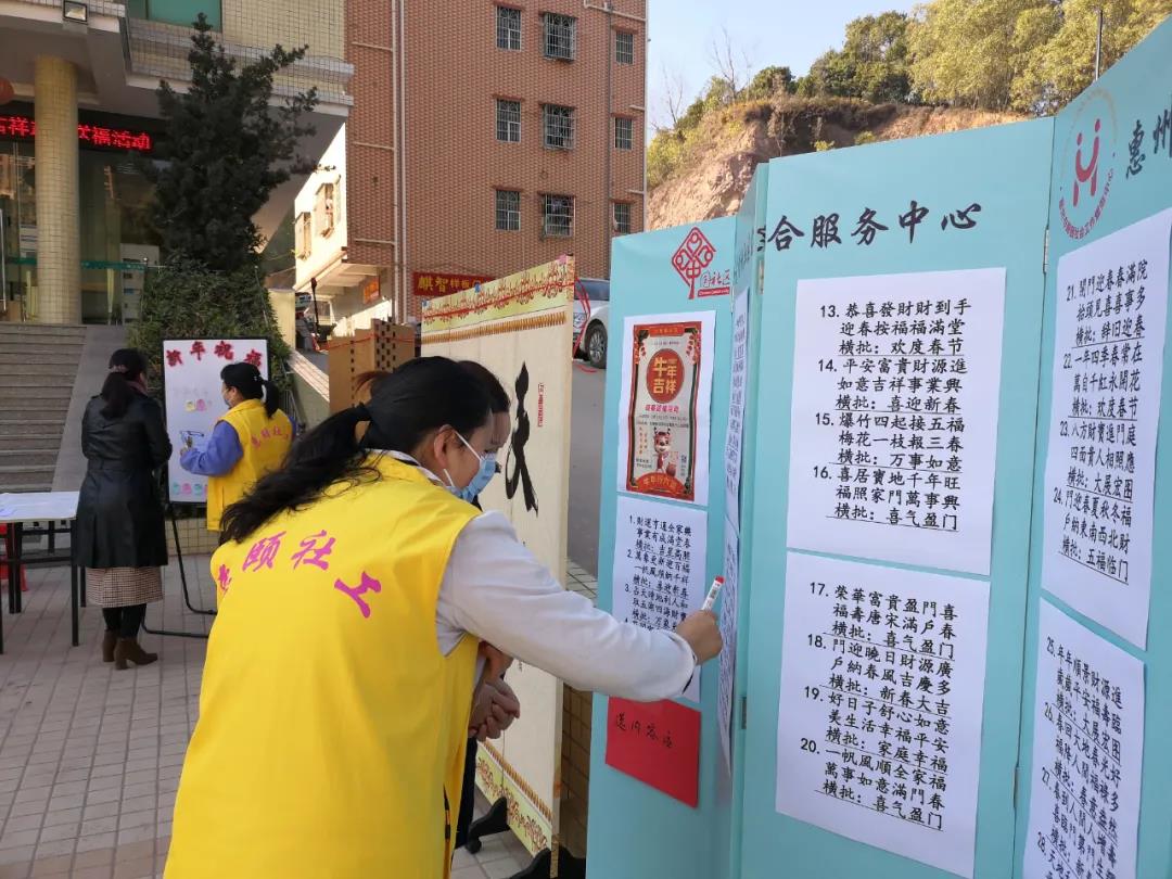在2021年春节将至,为让居民感受优秀传统文化和浓浓的节日气息,丰富社区居民的文化生活。1月13日,在惠州市仲恺高新区惠环街道办事处和古塘坳社区居委会的指导下,惠颐驻古塘坳社区综合服务中心社工联合惠州市老年大学书法爱好志愿者和社区书法爱好志愿者以“分批次、限人流”的形式开展了古塘坳社区牛年吉祥迎春送福活动,为社区家庭送上节日祝福。