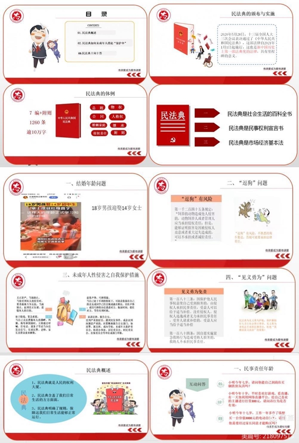 《民法典》260条,逾10万字,包括总则,物权,合同,人格权,婚姻家庭、继承、侵权责任和附录,共8个部分组成;学好民法典,护航新生活,让法治的种子在青少年的心灵深处播种、成长,用民法典,做一名学法、知法、懂法、守法的好学生。