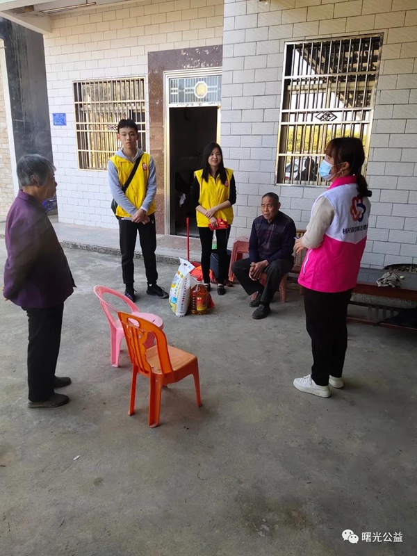 家庭等10户家庭,志愿者们分成三组,挨家挨户入户探访,与村民亲切互动、暖心询问,还给他们送上食用油、大米、腊肠、粒肠等生活用品