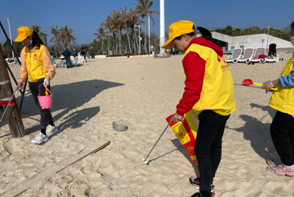 2月18日大年初七,春节假期志愿服务最后一天,大亚湾区蔚蓝公益协会还组织了近40名大小志愿者在黄金海岸开展亲子净滩活动,大家齐心协力将沙滩清理得干干净净。