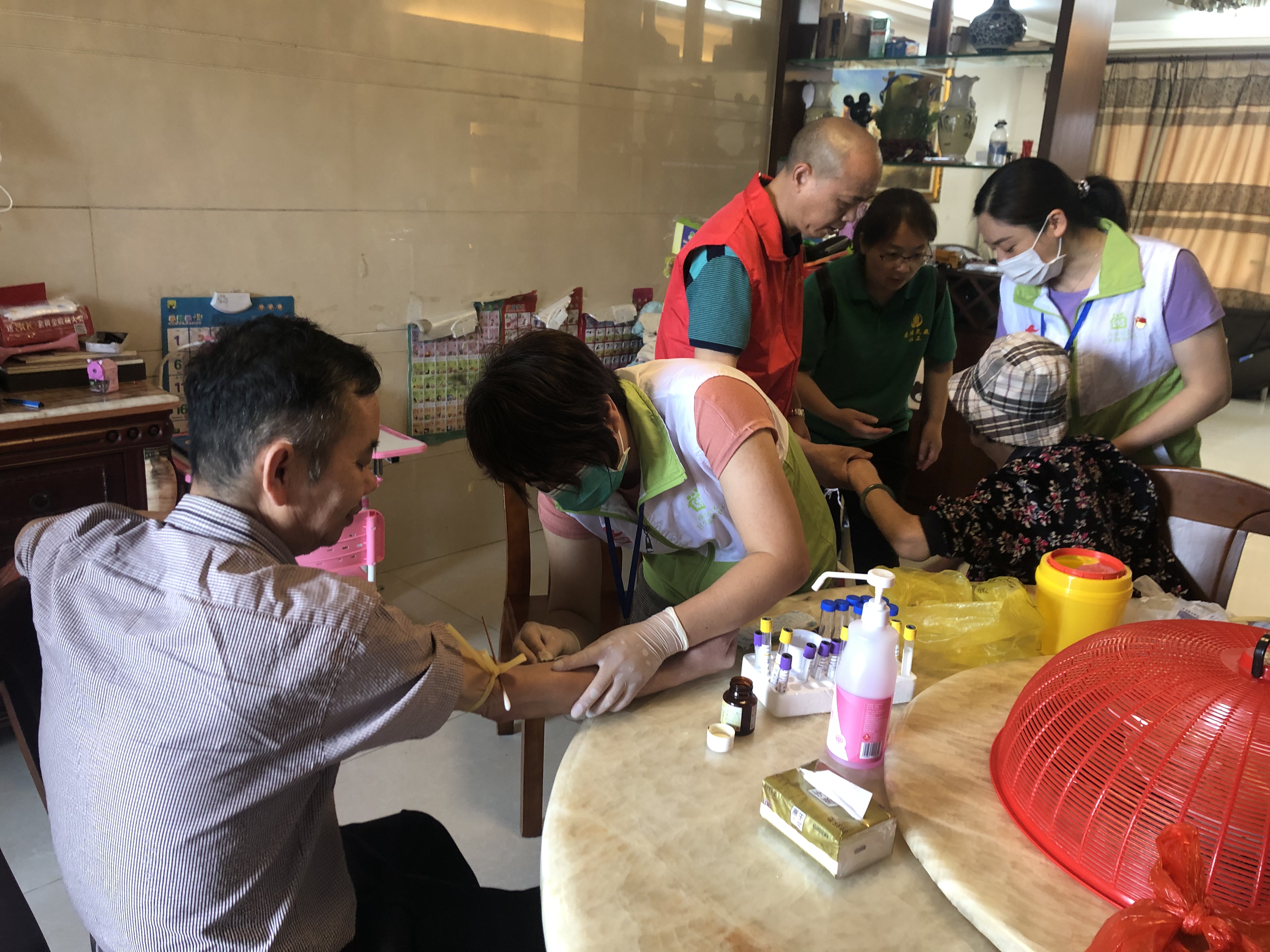 本次入户体检的居民都是上了年纪的老人家,他们当中不乏有腿脚不利落、失明,出不了远门,也不愿意麻烦家中的后辈陪他们到医院。来到服务对象家门口,长者们热情地接待了我们。随后,医护志愿者们细心地为长者们测量血压、抽血、B超、心电图等各项检查。社工及党员志愿者便跟长者的亲属了解长者的日常生活情况,从而了解他们的服务需求。