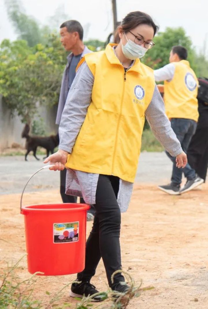 活动未开始,人们就已早早准备好,五颜六色的水桶大小不一地排列着,分别在村口和学校等待着。看到水车和黄色志愿者的身影,现场立马沸腾起来。“不要着急,一个接一个”志愿者们一边在维持现场的秩序,一边积极地帮助群众装水提水,确保送水活动有序进行。