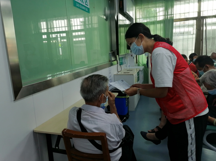 在四楼,医护人员详细询问了吴阿姨的常用药和近期身体状况,确保她的身体基础状况良好,符合接种条件。吴阿姨并在志愿者张桂芳的帮助下填表、登记,很快就完成了疫苗接种。“接种完疫苗,心里就踏实了。多亏了你们志愿者全程陪着我,就像亲闺女一样细心周到。”吴阿姨感叹道。在留观区等待时,志愿者钟冬禅也是始终陪伴在老人们身边,观察他(她)们的身体状态,陪着聊天直到留观结束。