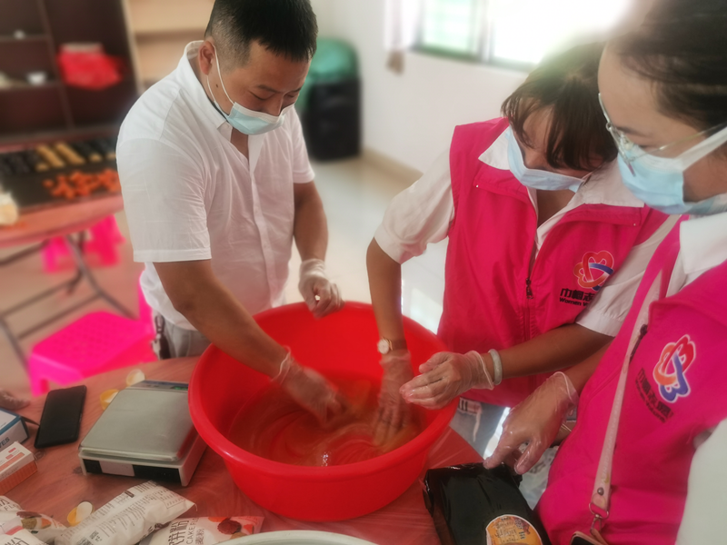 月饼,是久负盛名的中国传统糕点之一,中秋节节日食俗。月饼圆又圆,又是合家分吃,象征着团圆和睦。活动招募村委干部、志愿者、亲子家庭成员等共同制作“冰皮月饼”。冰皮月饼看似简单制作,但工序繁琐,社工详细讲解“冰皮月饼”的制作流程,分为“冰皮”制作、“绿豆馅”制作、包裹印模三大工序。随后,、大家参与月饼制作,乐在其中,看着印出的一个个圆圆的月饼,大家脸上都挂满了笑容,“制作月饼是一件很有意义的事情,月饼象征着团圆、幸福,我们亲手制作的月饼,和社区的老人们、居民们共同分享,制作的是月饼,分享的是祝福与快乐。”参与者说。