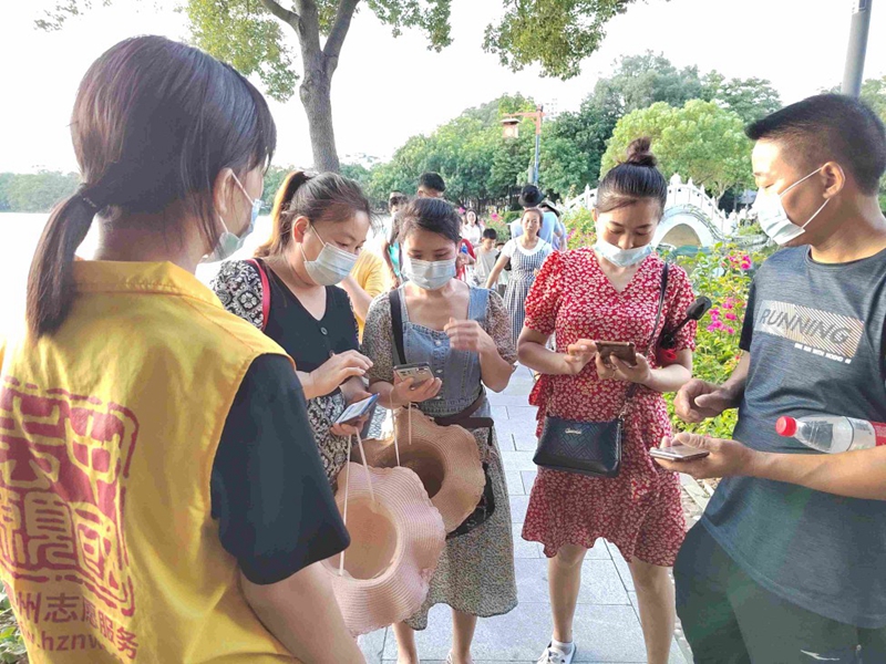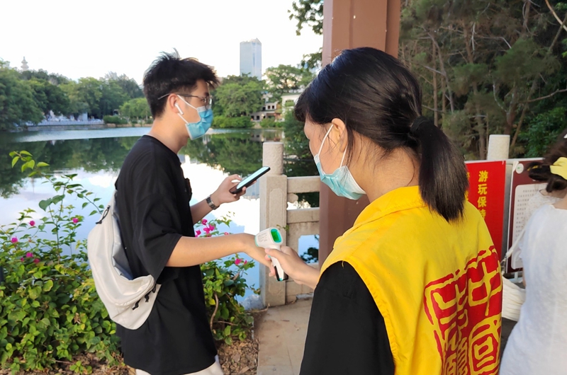 中秋节当天下午,记者在市区西湖景区院入口处看到,对准备进入景区的游客,这里的志愿者和工作人员都要进行检查健康码、提示戴口罩、测温等常态化疫情防控措施。(文图 惠州报业全媒体记者朱金赞)