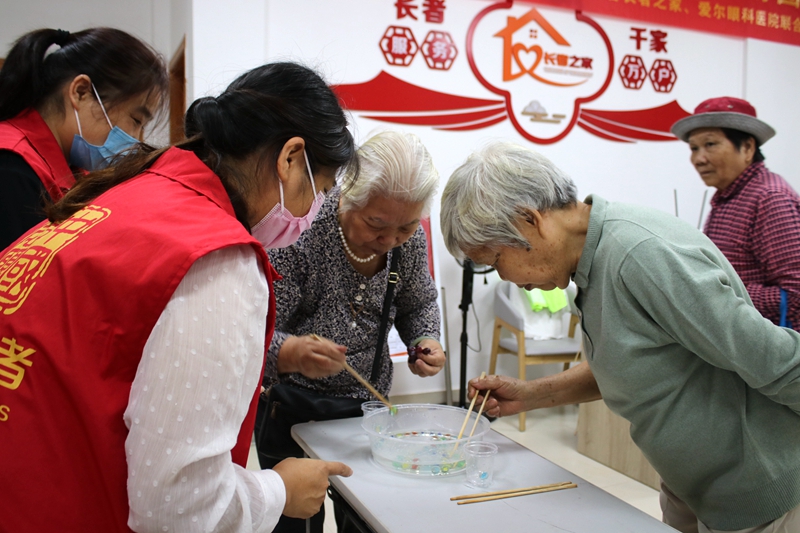 此次游园活动设置了有奖问答、才艺表演区、游戏区、眼科义诊区,长者们可以根据自己的兴趣进行游玩或体验。有奖问答都是关于重阳节知识的,让长者更好了解重阳节知识;游戏区设置了夹玻珠、吹乒乓球等游戏,让长者更好锻炼手眼协调能力;才艺表演区则由长者自由发挥,其中大家一起合唱《我和我的祖国》,用歌声表达对党和政府的感恩之情,正是在党和政府的关爱下,老年人才能有今天幸福快乐的生活;在义诊区,眼科医生用专业的器材给需要了解眼部健康的长者检查眼睛,为他们提出诊疗建议……丰富有趣的游园活动,让现场充满欢声笑语,最后大家一起享用茶点,畅享幸福时光。