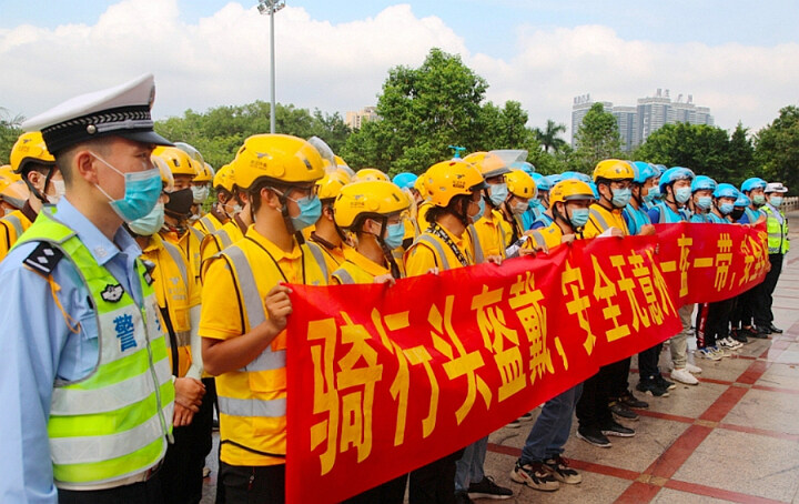 外卖骑手宣誓文明行车,共同维护交通安全。