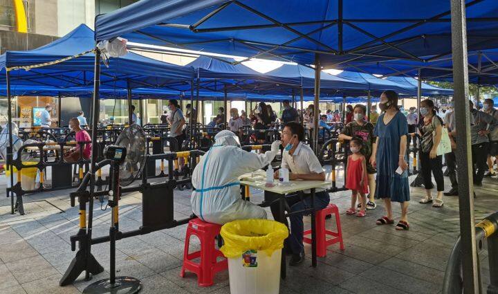 “今天下午太热了,戴的一次性手套都换了三双,脱下来里面的汗都能像水一样倒出来。”下午6点多,在富民小学采样点,核酸检测工作告一段落,来自区人社局机关的10名党员志愿者与其他志愿者一起,在学校操场席地而坐,匆匆吃完盒饭后,又赶紧投入到晚上的核酸检测志愿服务行动中。