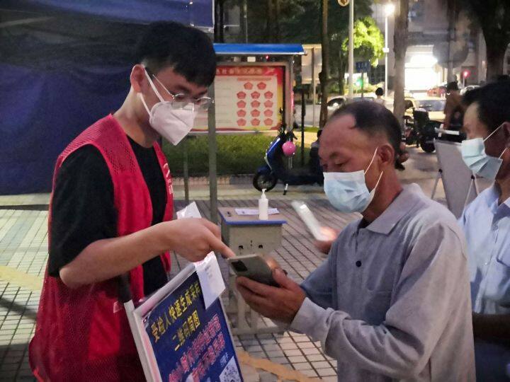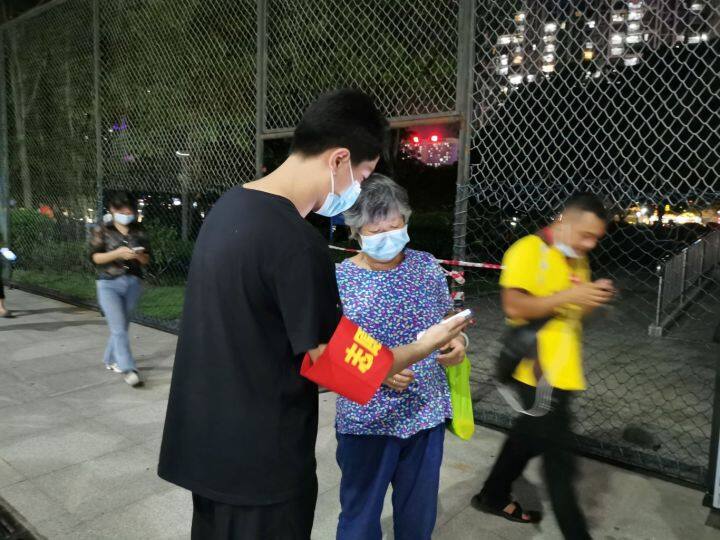 69岁的张秀兰与姐妹们站立在通道边,为现场群众提供扫码指引、维持秩序等服务,尽管已满头大汗,但张秀兰精气神十足。“平时我们都坚持锻炼,身体杠杠滴,参加这种志愿服务完全没问题。”张秀兰告诉记者,8月17日她们就已参加过一次大规模的核酸检测志愿服务,那天还是在黄码专区,期间下了一场大雨,衣服鞋子都湿了,但大家依然从下午1点半坚守到晚上7点。“今天大家又很踊跃地报名接龙,我们下午3点多就来了,服务到晚上8点。”听到周围有人夸她年轻,张秀兰乐呵呵地说:“多做公益,人就显得年轻!”