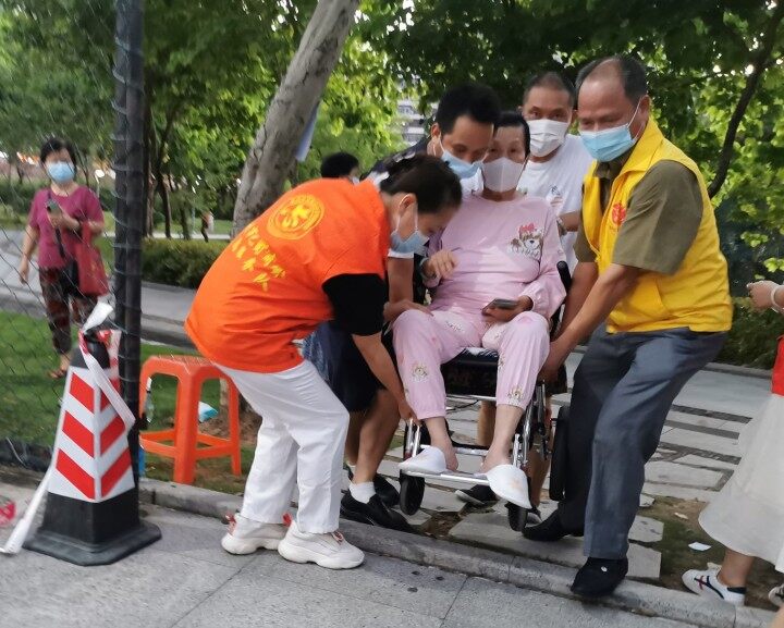 22日晚7点,在新湖公园核酸检测点,附近前来参加核酸采样的居民逐渐增多。其中有一位坐着轮椅的李阿姨在家人陪同下前来检测核酸,志愿者们看到后,立即上前帮忙抬起轮椅走过一段有点凹凸的石板路,并为她打开绿色通道快速检测,扫码打卡、体温测量、出示核酸码,整个过程仅用了三分钟。“谢谢你们帮忙,辛苦了!前几天我来做核酸也是你们帮我。”李阿姨连声对志愿者和工作人员道谢。
