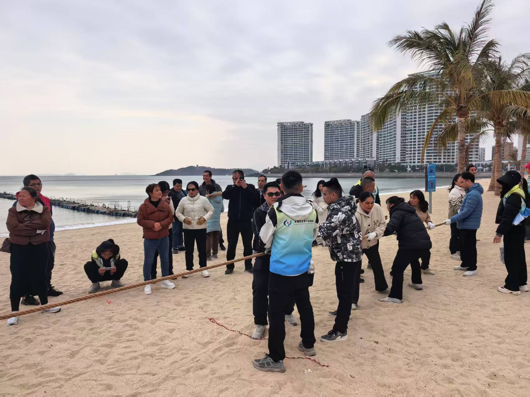 活动以“趣味互动、融合共乐”为核心,设置了拔河、两人三足、呼啦圈传送等多个适合视障人士参与的趣味项目。在拔河比赛中,视障人士与志愿者默契配合,喊着整齐的口号发力;两人三足环节里,大家手挽手、步调整齐,一步步迈向终点;呼啦圈传送时,现场笑声不断,每一次顺利传递都引来阵阵掌声。这些项目不仅让视障人士在沙滩上体验到运动的快乐,也打破了沟通壁垒,让志愿者与视障人士在互动中加深了解。