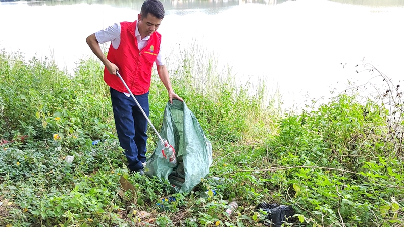 志愿者在东江边上捡拾垃圾。惠州报业全媒体记者朱金赞 摄