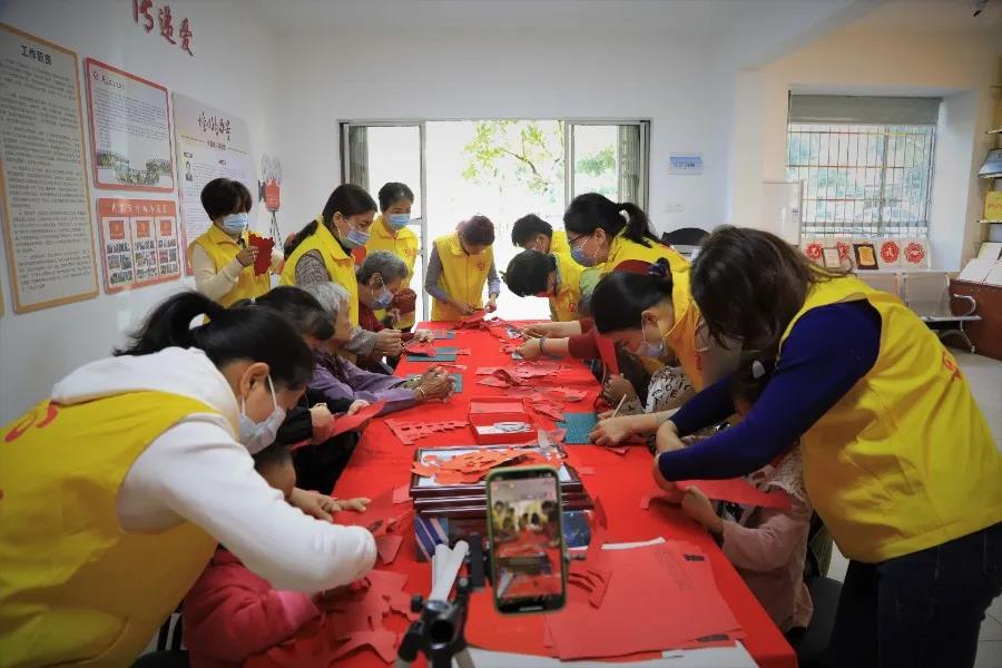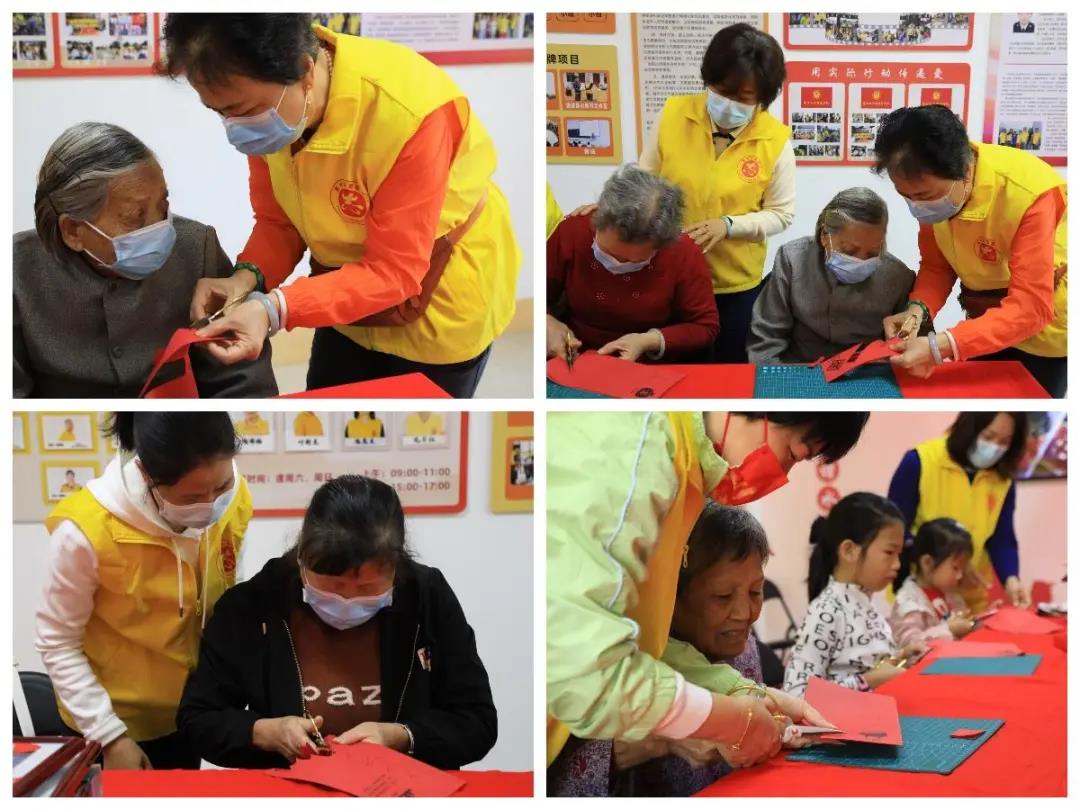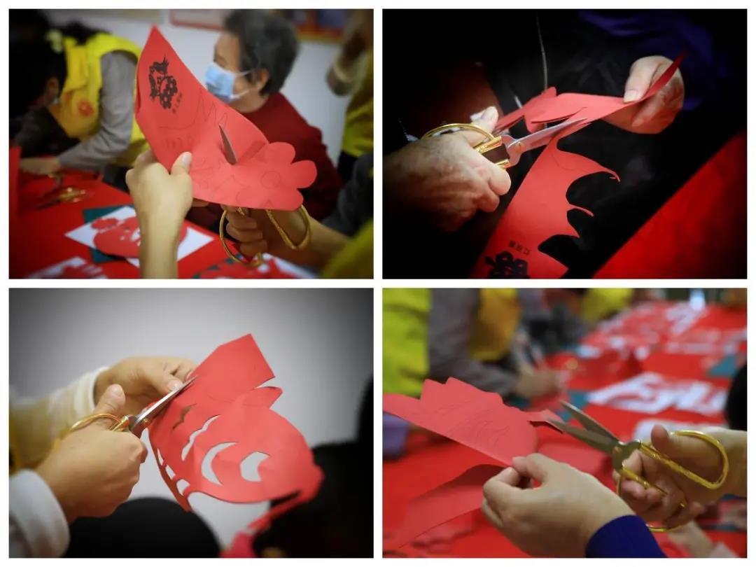 志愿者和老人们围坐在一起,一边热烈讨论着剪纸的技巧方法,一边亲手实践,共同绘制剪纸。活动现场一派热闹和喜庆气氛,大家互相招呼,互话家常,其乐融融,大家在欢声笑语中一起体验剪纸的传统文化,让老人感受到了快乐。