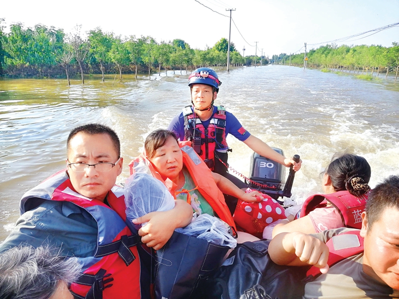 余红兵(后一)驾驶橡皮艇救援。