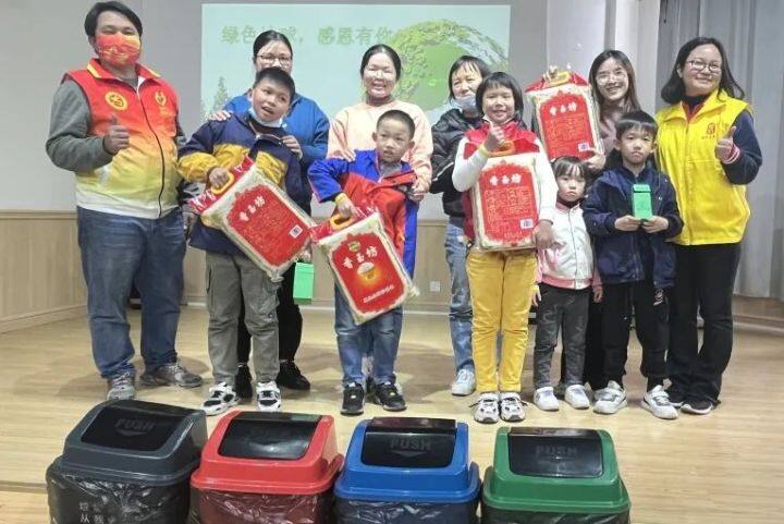 志愿者还教大家进行了垃圾分类,通过垃圾分类知识抢答、朗诵《垃圾分类儿歌》、手工制作垃圾桶,进一步加深对垃圾分类的理解。