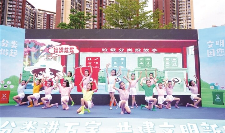 活动通过“政府搭台,群众参与”的方式,充分调动广大群众的积极性和创造性。现场以丰富多彩的原创节目开场,小朋友们把垃圾分类与快板、时尚秀、舞蹈等多种表演形式相结合,宣传垃圾分类知识。其中,快板“垃圾分类靠大家”节目,将垃圾分类知识与大家细细分说;垃圾分类时尚秀上,小模特们穿着用可回收垃圾设计制作的各种礼服潇洒走秀;集体舞蹈“垃圾齐分类”活力四射。