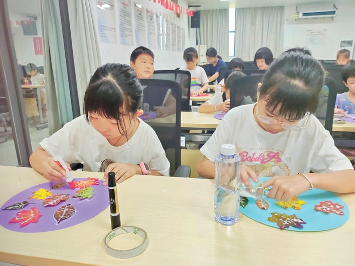 孩子们制作树叶贴画。惠州日报记者朱丽婷 特约通讯员邓秋娣 摄