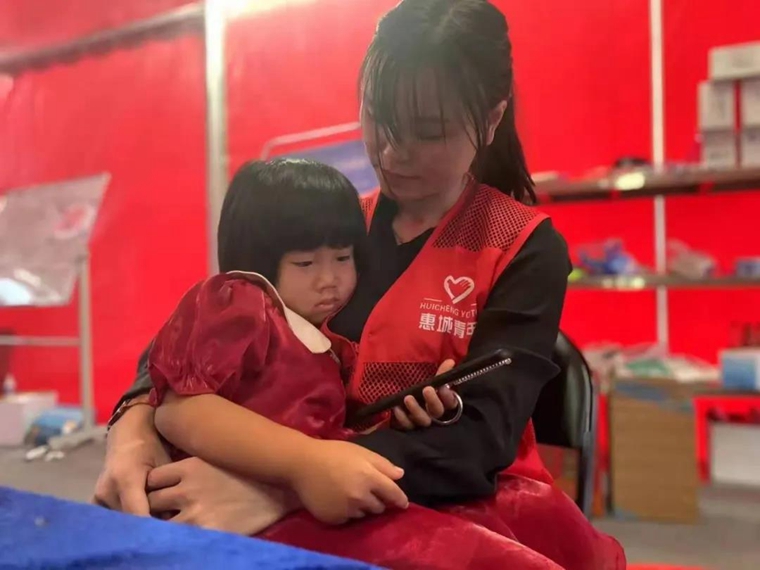 在找到亲人前,志愿者一直陪伴照顾着走失的小女孩。