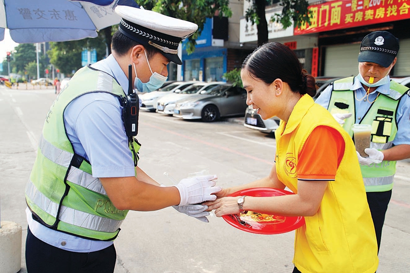 爱心群公益团队送绿豆水,执勤交警和志愿者享清凉。图片来源:由爱心群公益团队提供