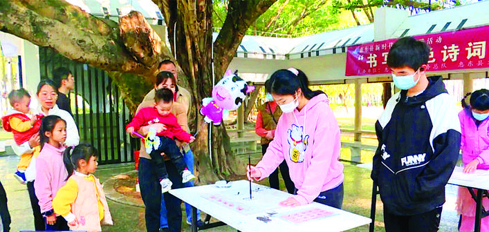 活动通过现场师生书法展示表演、老师现场书法教学、群众参与等形式开展。书写内容以经典红色诗词为主,让现场群众在书写和欣赏的过程中,感受红色革命教育的洗礼。