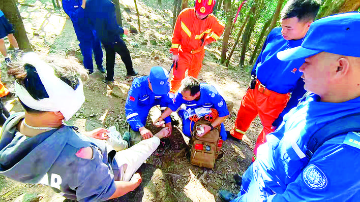 救援人员现场处置驴友伤情。惠州日报记者李芳娟 通讯员夏少兰 摄