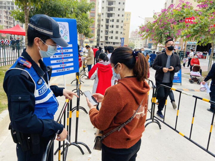 “请提前准备好身份证,出示粤康码、葵花码,按秩序排队!”“为了安全起见,请大家间隔一米的距离,耐心等待一下!”各核酸检测点上,都能看见身穿红色马甲的志愿者、黄色马甲的社工在核酸采样点忙碌着,引导大家有序进行核酸检测。