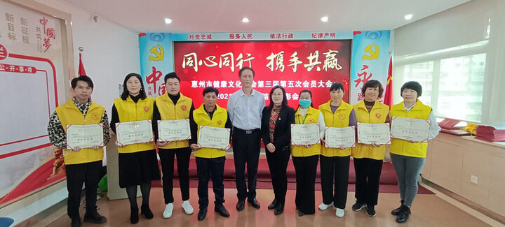 日前,惠州市健康文化协会举办“同心同行·携手共赢” 第三届第五次会员大会。会议总结2021年工作,展望2022年发展方向,并表彰优秀党员、优秀志愿者、最美志愿者、优秀会员单位等。