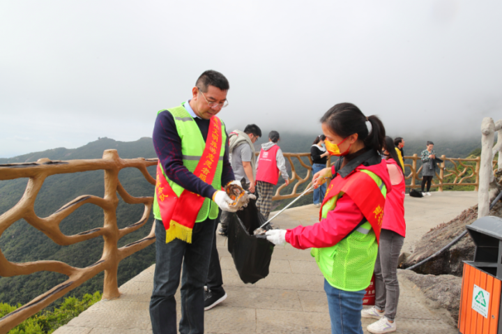 惠州市“中国好人”、“广东好人”、全国道德模范等代表在罗浮山鹰嘴岩周边开展环保志愿服务活动。