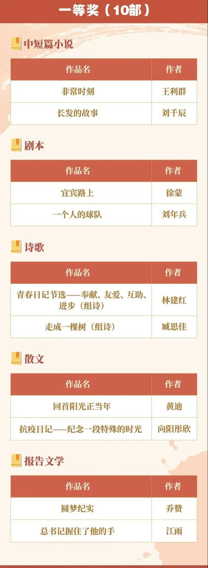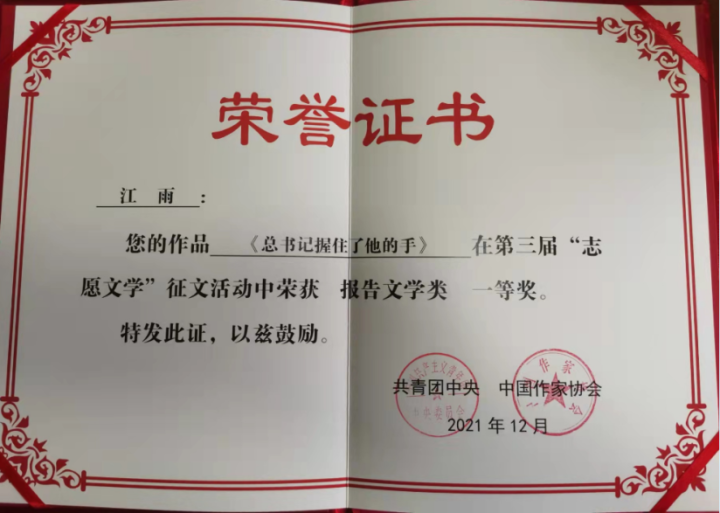 中篇报告文学《总书记握住了他的手》荣获报告文学类一等奖。